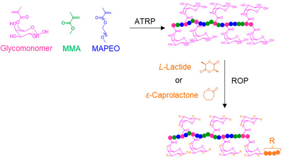 There is one example of galactose-containing glycopolymer brush-like structure, synthesized by the combination of ATRP and ROP, that is not attached to a surface [109]. For this, a random glyco(co)polymer containing methyl methacrylate (MMA), α-methoxy, ω-methacrylate (ethylene oxide), and a methacryloyl-d-galactopyranose-based monomer was prepared by ATRP. Next, a brush-like structure was obtained by performing ROP of ε-caprolactone or L-lactide from the free hydroxyl groups of the galactose residues (Figure 12). The authors performed a complete characterization of the glycopolymer structure by nuclear magnetic resonance, size exclusion chromatography, and Fourier-transform infrared spectroscopy. Unfortunately, no application was suggested by the authors for this new brush-like polymer. In addition, it would have been interesting to evaluate the influence of the steric hindrance of this type of “less blocked” structure, in comparison to the ones attached to surfaces, on the binding of lectins.