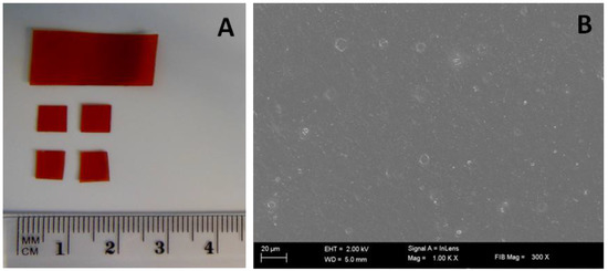 PVA/HPMC_B film samples with incorporated PVP-I. (A) An optical image of samples before assessment (picture taken with a Nikon S9300 camera using a macro lens); (B) representative scanning electron microscopy (SEM) image. Scale bar 20 µm (10,000×).