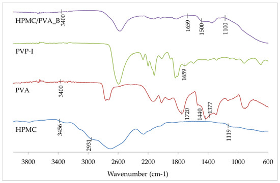 Fourier Transform Infrared (FTIR) spectra of pure hydroxypropyl methylcellulose (HPMC), pure PVA, PVP-I, and PVA/HPMC_B film with incorporated PVP-I.