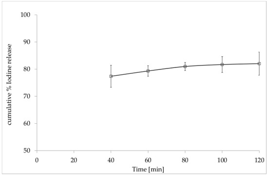 where released is the molar concentration of I2 calculated from the UV-VIS spectrum for 288 and 360 nm. declared is the molar concentration of the total I2 amount in the original sample (theoretically calculated based on the sample weight and its formulation). The cumulative percentage of release was calculated based on Equation (7):