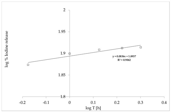 The findings displayed in Figure 4 show a non-linear-dependent I2 release profile for the film over time. Therefore, to interpret the release of the drug, the Korsmeyer–Peppas model presented in Equation (8) was used: