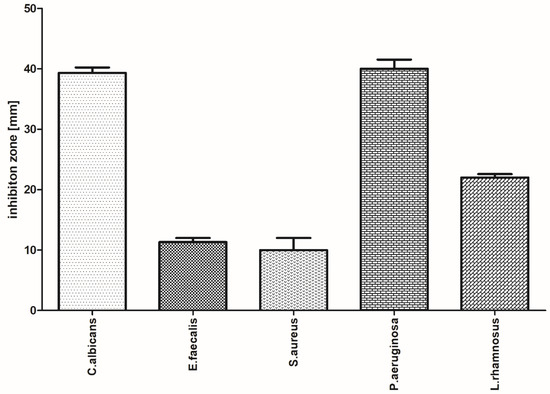 The antibacterial activities of the polyvinyl alcohol-hydroxymethyl cellulose film containing PVP-I were tested by the disk-diffusion method against five pathogens, namely, C. albicans, E. faecalis, P. aeruginosa, L. rhamnosus, and S. aureus. The PVA/HPMC_B film with incorporated PVP-I was shown to possess strong antimicrobial activity against three of the five strains tested. Images highlighting the inhibition of microbial growth and parametric values of zone sizes are presented in Figure 6 and Figure 7, respectively.