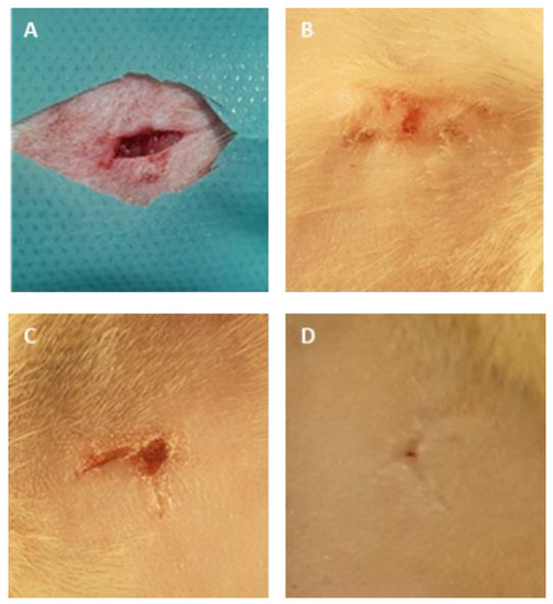 Representative macroscopic images of the skin of rats during and after the implantation procedure. (A) The subcutaneous pocket of rat skin created to place films; (B) the surface of rat skin 7 days after surgery after the placement of Spongostan; (C) placebo film without PVP-I (PVA/HPMC_B/C); (D), film with incorporated PVP-I (PVA/HPMC_B/T).