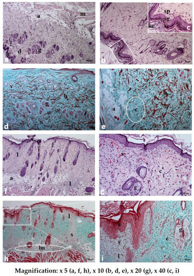 Histological examination of rat skin after the application of Spongostan (a–e) and placebo film (PVA/HPMC_B/C) (f–i) stained with hematoxylin and eosin (HE a–c,f,g) and Masson’s trichrome (d,e,h,i) staining: e-epidermis; sc-stratum corneum; sg-stratum granulosum; sp-stratum spinosum; ke-keratin; d-dermis; h-hemorrhagic zones; a-adipose tissue; m-muscular cells; g-sebaceous gland; c-collagen fibers; lm-leukocytes and macrophages; s, ”scar.” In the subcutaneous part of rat skin after the application of placebo film (h), a visible layer of inflammatory cells (lm) and a zone with disturbed layers, structurally different from the surrounding, healthy tissues, were observed.