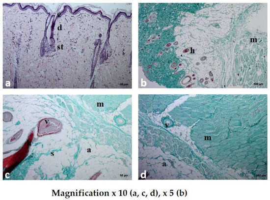 Histological examination of rat skin after the application of PVA/HPMC_B film with incorporated PVP-I (PVA/HPMC_B/T) stained with hematoxylin and eosin (HE) (a) and Masson’s trichrome (b–d) staining. The normal skin with a layered structure without inflammatory cells; e—epidermis; d—dermis; st—subcutaneous tissue; a—adipose tissue; m—muscle cells; h—hair; v—vessel; s—collagen septum.