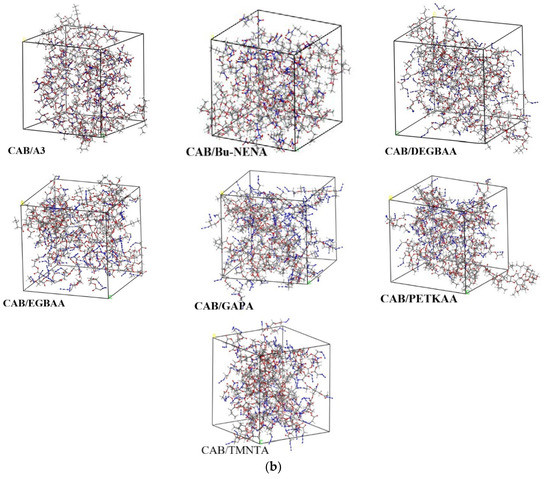 The amorphous models of CAB/plasticizer systems were then established using the Amorphous Cell module as shown in Figure 1. For the construction of these amorphous models, the quality was set to fine, the maximum number of steps was set to 50,000, and the density of the mixed system was calculated based on the mass ratio of CAB/plasticizer. Ewald was set as the electrostatic force, van der Waals was set as the atom based, and cutoff radius was set to 12.50 Å for the simulation. The mass ratio of CAB/plasticizer was set to 2:3, which is a commonly used ratio in PBXs, and the amounts of CAB molecules (3 chains, 734 atoms) in all amorphous models were the same. The plasticizer contents were approximately in the range of 30–60 molecules (1200–1800 atoms) in different systems, depending on the plasticizer.