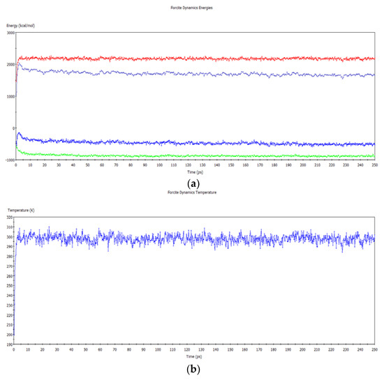 Dynamic energy-time (a) and temperature-time (b) curves of the molecular dynamics (MD) simulation. The red, light blue, dark blue and green curves in (a) represent kinetic energy, total energy, potential energy and non-bonded energy, respectively.