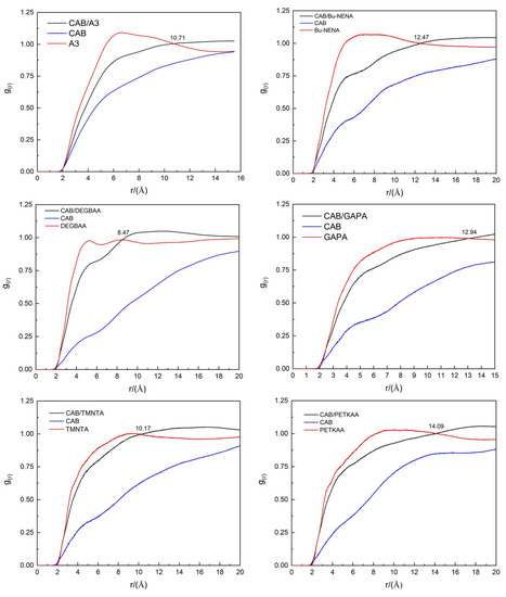 The RDFs of CAB and all plasticizers reach the peak values at the distances slightly shorter than 5.00–6.00 Å. It is well known that the distance ranges of hydrogen bond and van der Waals force are 0–3.10 Å and 3.10–5.00 Å, respectively [31,32,33,34]. Therefore, van der Waals force is the major intermolecular forces of CAB-CAB and plasticizer-plasticizer pairs. The RDF of CAB/plasticizer is lower than that of plasticizer, but higher than CAB itself in the range of 0–6.00 Å for all systems, suggesting that the compatibility between CAB and plasticizers seems not so good.