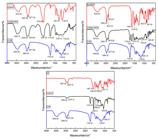 The CAB/GAPA system is analyzed as an example. CAB exhibits a broad and strong absorption peak at 3445.86 cm−1 due to the stretching vibration of -OH. The doublet peak at 2964.33 cm−1 and 2877.88 cm−1 are attributed to the antisymmetric and symmetric stretching vibrations of methylene group. The strong absorption peak at 1742.35 cm−1 can be assigned to the stretching vibration of -C=O. The peaks at 1165.11 cm−1 and 1065.15 cm−1 are ascribed to the stretching vibration of the unique -COCOC-polyether structure in CAB.