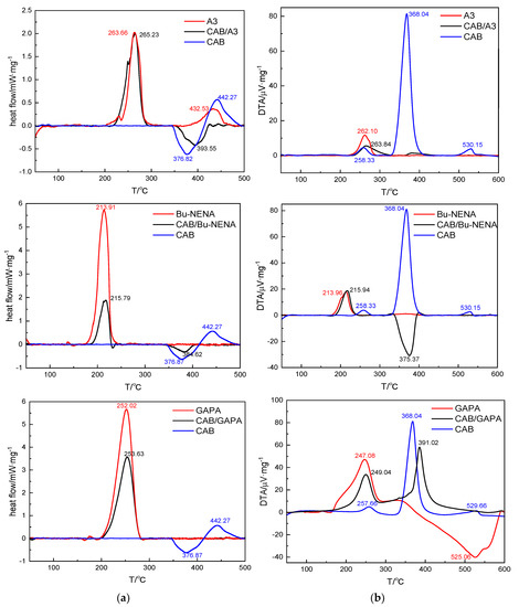 The compatibilities between CAB and plasticizers were respectively evaluated by differential scanning calorimetry (DSC) using a DSC131 Evo instrument (Setaram, France) and differential thermogravimetric analysis (DTA) using a DTA-60 thermal analyzer (Shimadzu, Japan) under 50 mL/min nitrogen flow atmosphere at the heating rate of 10 K/min.