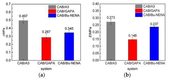 Figure 6 shows the tensile strengths (σ), Young’s moduli (E) and strains at break (ε) of the three CAB/plasticizer systems measured experimentally. The stress-strain curves of CAB/plasticizer systems were measured firstly and the values of σ, E and ε were calculated from the first linear part of the stress-strain curves (elastic domain), respectively.