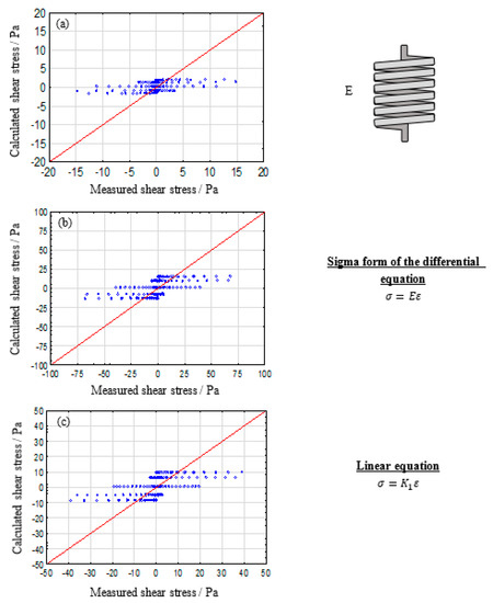 Calculated vs. measured shear stresses plot for a simple spring for describing the viscoelastic properties of 2% (a), 5% (b), and 8% (c) alginate solutions.