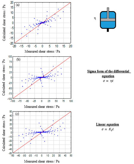 Calculated vs. measured shear stresses plot for a single dashpot for describing the viscoelastic properties of 2% (a), 5% (b), and 8% (c) alginate solutions.