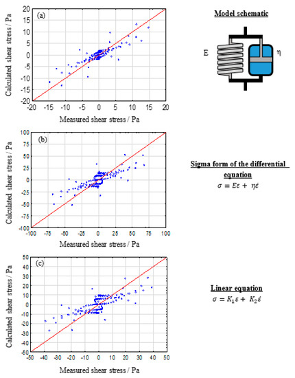 From Table 2 it is evident that the Maxwell model is the suitable model if a linear equation can describe the stress as a function of and . If the stress can be better described by a linear function of and , the Kelvin–Voigt model should be applied.