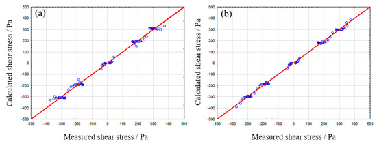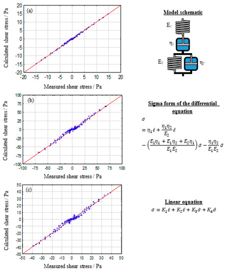 Calculated against measured shear stress plot for the used burgers model system for 2% (a), 5% (b), and 8% (c) alginate solutions.