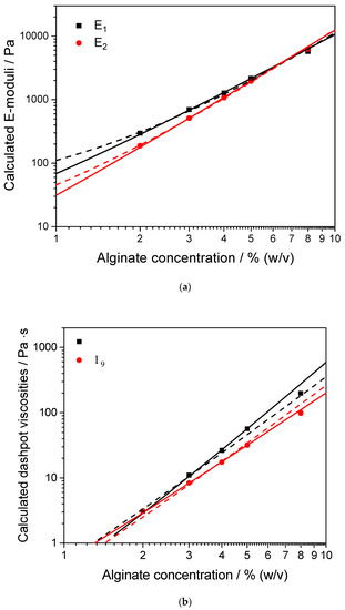 By replotting the characteristic values on a double-linear, linear–log, and log–log scale their mathematical behavior becomes evident. Since a linear trend on a log–log scaled graph can be observed, a power-law-like behavior is concluded, which is also represented by the shown fits. Since non-crosslinked alginate solutions can be described as two component composites, consisting of the solvent (mainly water) and the polymer, the following quasi power-law functions can be applied for describing the determined moduli dependent on the polymer concentration [51].