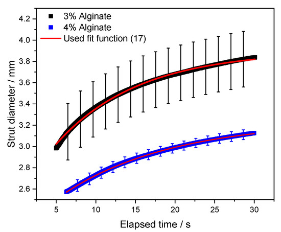 Time dependent strut diameter of 3% and 4% alginate solutions.