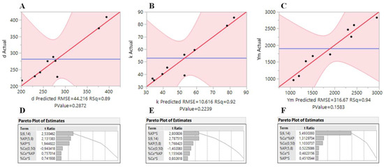 Actual vs. predicted responses (A–C) and Pareto plots (D–F) resulting from full factorial (23). Bulk density (d) in kg·m−3, thermal conductivity (k) in mW·m−1·K−1 and Young’s modulus (Ym) in kPa.