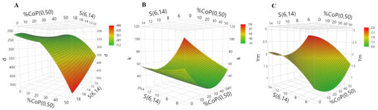 Surface responses for (A) bulk density (d, kg m−3), (B) thermal conductivity (k, mW·m−1·K−1) and (C) Young’s modulus (Ym, MPa).