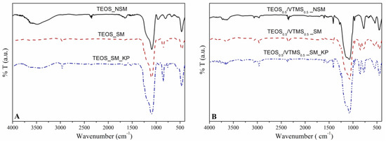 FTIR spectra before (NSM) and after surface modification (SM), and after adding fibers (KP), for (A) TEOS and (B) TEOS0.5/VTMS0.5 samples.