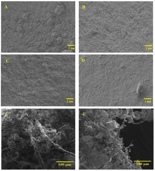 In Figure 4E,F, it is possible to observe that KP fibers form a reinforcing network that is covered by the silica matrix, in this way providing monolithicity to the aerogels. In samples prepared with lower S value (Figure 4F), a better coverage of the fibers by the silica phase is observed, as expected.