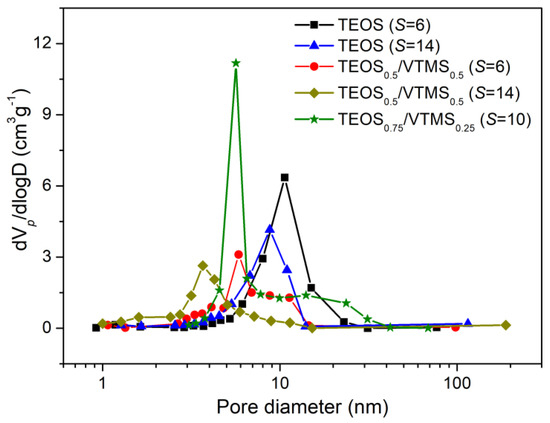 The specific surface areas of the TEOS-based aerogels (~450 m2·g−1) were lower than those of TEOS-based aerogels synthesized in methanol [29], or synthesized in ethanol but that were silylated with TMCS [13,17,18,30], which is due to the more favorable synthesis compounds in the latter. However, these compounds (methanol and TMCS) represent more hazard for the operators and environment. The introduction of VTMS as a co-precursor leads to a slight increase in the surface area for S = 6 (Table 2), and for S = 14 the values are much higher (~615 m2·g−1), comparable with those for a similar TEOS/VTMS system [7]. The increase in surface area for the TEOS/VTMS-based aerogels may be explained by the higher amount of mesopores, since when vinyl groups were introduced in the aerogels, a reduction in the average pore diameter was observed (Table 2, Figure 5), probably due to more interaction between the KP and the organically modified matrix and to the higher shrinkage already discussed.