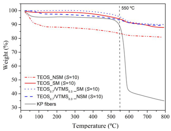 Thermograms for TEOS and TEOS0.7/VTMS0.3 samples containing 5%wt. of KP, with surface modification (SM) and non-surface modified (NSM).