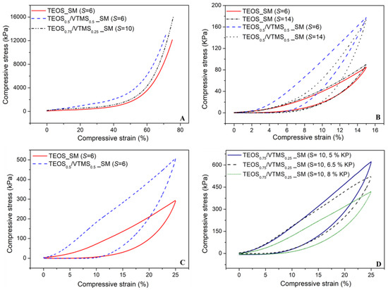 Stress–strain curves obtained by uniaxial compression with a load cell of 3 kN (A,C,D) and 50 N cell (B). (A) Silica aerogel composites (TEOS; TEOS0.5/VTMS0.5 and TEOS0.75/VTMS0.25; S = 6, 6 and 10) tested up to maximum densification. Effects of (B) S in TEOS and TEOS/VTMS-derived systems, (C) co-precursor and (D) different fibers content, under a uniaxial compression-decompression cycle.