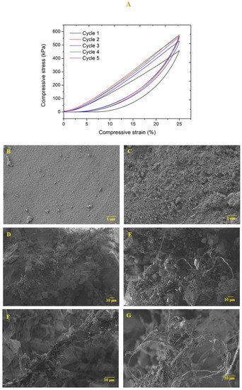 (A) Cyclic compressive test for TEOS0.75/VTMS0.25 (S = 10; KP = 6.5%). SEM images of (B) surface and (D,F) cross section before the compression test. SEM images of (C) surface and (E,G) cross section after 5 cycles of compression-decompression.