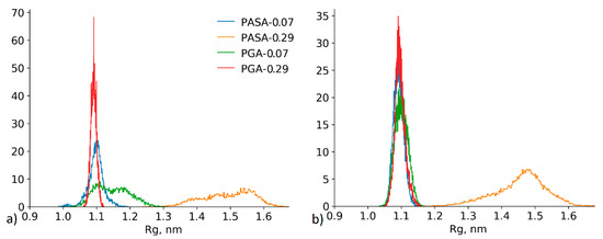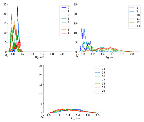 4.2.3. Effect of the Conformational State Exchange on the Gyration Radius Distribution
