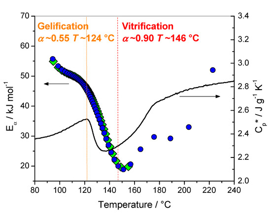 Combining DSC and oscillatory rheometry, it was reported for this system that gelation occurs at α around 0.55 at a temperature of 124 °C, and vitrification at α around 0.90 at a temperature of 146 °C [16]. These values are in perfect agreement with the data of Figure 2. The temperature of 124 °C corresponds to the beginning of the Cp*’s decrease, while the temperature of 146 °C corresponds to the minimum of Eα (note that for nonisothermal conditions the heating rates used for the evaluation of Eα are higher than the rate used for the measurement of Cp*, which induces a slight shift of the Eα values to a higher temperature). For a temperature higher than 140–150 °C devitrification occurs, as attested by the Cp* increase, and chemical reactions are reactivated.