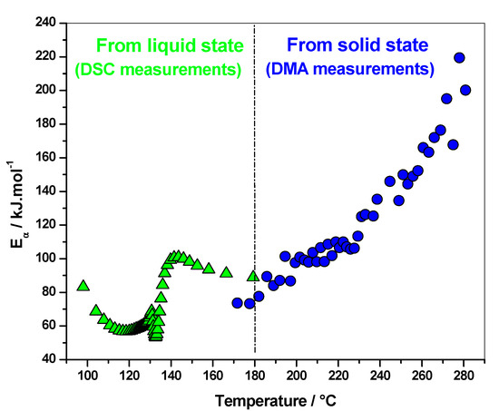 Polymerization of FA into PFA with maleic anhydride (MA) as acidic initiator was studied by DSC and DMA [27]. DSC was used to monitor the reaction in the liquid state, while DMA was performed on cured materials, via heating samples from 20 to 350 °C following the residual reactions occurring in the solid state. An increase of the elastic modulus was observed for all the systems between 170 and 290 °C, while no thermal event was recorded at a temperature higher than 220 °C on the first DSC heating curves. Thus, this increase was attributed to residual crosslinks occurring in the rubbery state after intensive post-curing. The effective activation energy dependency (Eα), as a function of temperature computed from DMA measurements, shows increasing values, which corresponds to a kinetic control by the diffusion of long polymeric chains (Figure 4). As the PFA material progressively cross-links in the solid state, the molecular mobility becomes more restricted, which leads to an increase in the activation energy. The values are lower in the presence of solvents, attesting that chains are less constraining in this case. More remarkably, there is a perfect continuity between the Eα-dependencies obtained for polymerization from the liquid state (DSC measurements) and those obtained for additional cross-links occurring in the rubbery state (DMA measurements), the final values of the reaction starting from the liquid state being in good agreement with the first values of the reaction starting from the rubbery state. The combination of DSC and DMA data allows one to study the polymerization kinetics and get mechanistic information over a wide temperature range, starting from the liquid state and ending in the solid state. This perfect continuity is an additional indication of the physical meaning of the kinetic parameters obtained (Figure 4).