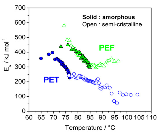 The variation in the effective activation energy (Eα) during the glass transition, for both poly(ethylene terephthalate) (PET) and PEF amorphous and semi-crystalline samples, as a function of temperature, exhibits a decrease in the effective activation energy for all samples (Figure 7). This decrease can be interpreted in terms of the cooperative motion of the chain segments involved in the glass transition. In the glassy state, only local motions of the chain segments may occur because of the very low molecular mobility. As the temperature rises, the molecular motion increases, and the translational motion of the segments and the whole chain becomes possible. This results in a decrease of the energetic constraints, which is reflected in a decrease of the effective activation energy. The effective activation energies (Eα) are lower for PET, compared to the values obtained for PEF. The values obtained for amorphous PET are higher and correspond to a lower temperature domain, as compared with the values of the semi-crystalline samples. In addition, these values are in perfect continuity with the values obtained for amorphous samples. The situation is very different for PEF. The values are very close for both amorphous and semi-crystalline PEF. These results confirm the hypothesis of a reduced coupling between amorphous and crystal phases for PEF, in agreement with results obtained from the evaluation of Tg for the Mobile Amorphous Fraction (MAF) of PET, and of PET by TMDSC and DMA. Thus, analysis of the Eα-dependencies has confirmed the conclusion that the relaxation of MAF is less influenced by the presence of crystals in PEF than in PET [50].