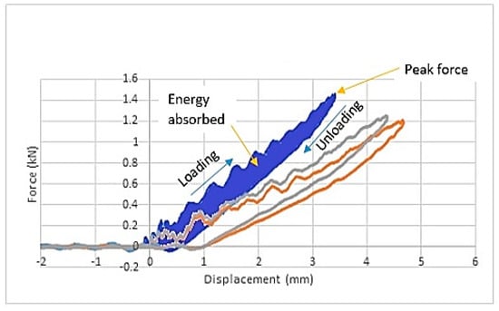Another important value extracted from the force-displacement graph is the energy absorbed by the samples, which can be determined from the area under this graph. The energy absorbed is the kinetic energy transferred from the impactor to the samples during impact [24]. Both the energy absorbed throughout the impact event and the energy absorbed up to the peak deformation can be obtained from the force-displacement graph as shown in Figure 1. An example of a force-displacement graph for fully penetrated or perforated samples during impact can be seen in Figure 2.