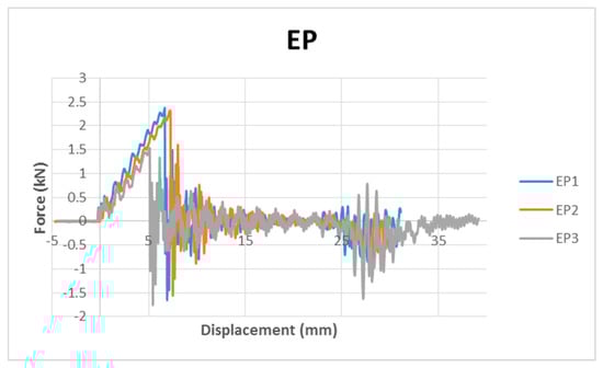 Important information regarding the damage progression within the sample during an impact event can be obtained from the force-displacement graph. The movement of the impactor and the deformation of the impacted surface of the sample during contact with the impactor are marked as displacement values in the graph [22]. Figure 1 shows the force-displacement graphs of EP at the lowest impact energy level of 2.5 J.