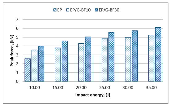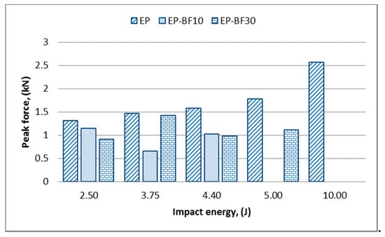 Figure 3 shows the variation of the peak force for the EP and EP-BF composites at the first range of impact energy levels.