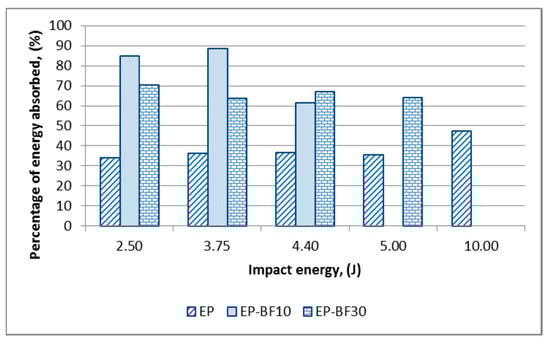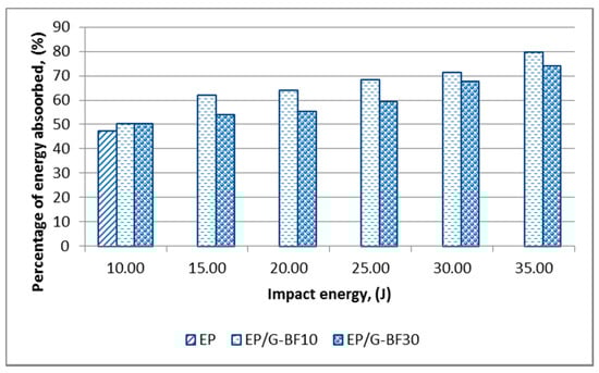 Figure 5 and Figure 6 present the percentage of energy absorbed by the EP, EP-BF and EP/G-BF composites, respectively.