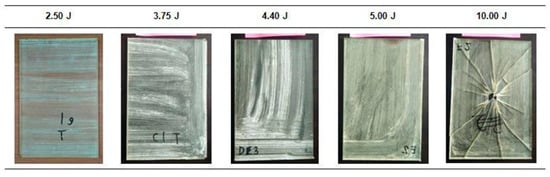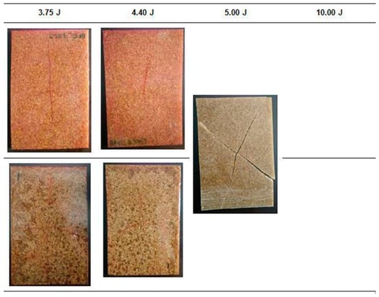 As depicted in Figure 9, matrix cracking was detected on the EP-BF10 samples at 2.50 J, 3.75 J and 4.40 J impact energy levels. The matrix cracking propagates from the top surface to the bottom, and from the centre (where the impactor was dropped) to the sides of the rectangular plates. The EP-BF10 samples can withstand the first three impact energy levels; the propagation of matrix cracking stopped before reaching the sides of the samples. However, 10.00 J of impact energy enabled the matrix cracking to propagate until the end sides of the samples, thus breaking the rectangular plates into pieces. Compared to the visual look of the broken EP samples in Figure 9, the broken sample of EP-BF10 indicates a less severe damage as it broke into four large pieces that can be laid out, instead of numerous smaller pieces. Micro-sized fibres with a random orientation limit the analysis of the damage, as no trend can be suggested concerning the relationship of the impact energy levels with the severity of the damage caused [27].