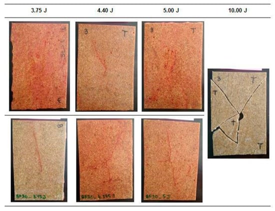 Matrix cracking was detected as propagating from the top to the bottom and from the centre to the sides of the impacted samples. However, small differences can be seen between the damage on the EP-BF30 and that on the EP-BF10, i.e., the number of lines of matrix cracking is lower than the number found on the EP-BF10. For the EP-BF30, only two obvious lines of matrix cracking were observed from the centre of impact, while in the EP-BF10 the damage propagated into four observable lines from the centre of impact. Figure 10 shows that the EP-BF30 withstood the 5.00 J impact energy but failed at 10.00 J, which is one level higher than for the EP-BF10. The damage analysis for the EP-BF30 is presented in Table 6.