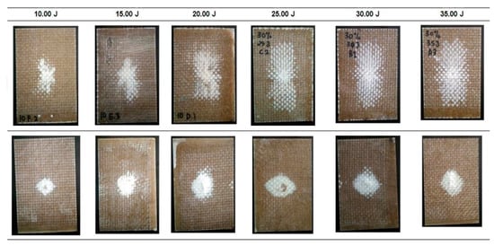 Figure 11 and Figure 12 show the damage propagation on the hybrid EP/G-BF10 and on the EP/G-BF30, respectively. Dye penetrant was not used as the damage is clearly visible and the area can directly be calculated from the surface of the impacted samples.