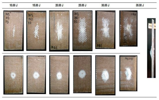 The damage on the non-hybrid EP-BF composites after the low velocity impact was observed with the aid of the dye penetrant and is shown in Figure 9 and Figure 10.