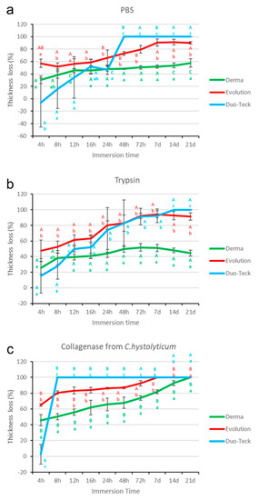 Degradation profile by % thickness loss analysis of the three experimental membranes (Derma Fina, Evolution Standard and Duo-Teck) over immersions periods up to 21 days in: (a) PBS, (b) trypsin and (c) collagenase from Clostridium histolyticum. Values shown are mean and standard deviation (n = 3). Significant differences between membranes within the same immersion solution are noted by low-case letters. Differences between different immersion solutions within the same membrane are pointed out with capital letters. Multiple comparisons were performed by Student-Newman-Keuls (p < 0.05).