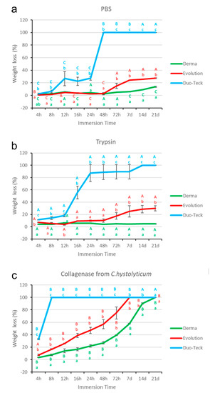 Degradation profile by % weight loss analysis of the three experimental membranes (Derma Fina, Evolution Standard and Duo-Teck) over immersion periods up to 21 days in: (a) PBS, (b) trypsin and (c) collagenase from Clostridium histolyticum. Values shown are mean and standard deviation (n = 3). Significant differences between membranes within the same immersion solution are noted by low-case letters. Differences between different immersion solutions within the same membrane are pointed out with capital letters. Multiple comparisons were performed by Student-Newman-Keuls p < 0.05).