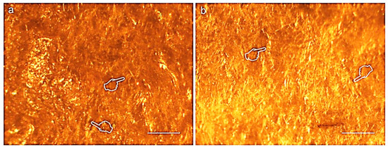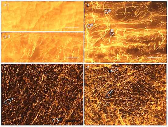 Figure 3 and Figure 4 display light micrographs taken from membranes after degradation testing. Both Derma Fina and Evolution Standard membranes displayed a smooth and compact surface morphology on the outer surfaces (Figure 3a and Figure 4a·I). The inner surfaces were fibrous and irregularly crumpled (Figure 3b and Figure 4a·II). As seen from the rough side (Figure 3c,d), the different collagen layers consisted of reticulated fibers. Multiple bundles of collagen of different sizes were aligned in parallel and were separated from each other by irregular spaces when Derma Fina was immersed in PBS (Figure 3d). In this membrane, the collagen fibers were also arranged in layers, which were paralleled to the surface. Within these strata, the degree of collagen fiber orientation was variable. While some layers of collagen fibers typically showed less uniformity regarding collagen fiber orientation and thus resembled an interwoven fiber network, others exhibited a higher degree of preferential fiber orientation.