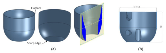 In this work, a part used in the pre-production of plastic parts has been selected as the benchmark. The part presents similar geometric basic features as the circular artifact shown in Figure 2. The circular artifact consists of a circular upper surface and a steep lower surface ending with a sharp edge (Figure 2). Two critical dimensions in terms of assembly and functionality of the artifact, the height H = 12 mm, and the diameter D = 14.5 mm, have been selected for the machine and process capability study. A fine tolerance class of ±0.1 mm was selected, taking into account the ranges of nominal lengths between 6–30 mm according to the ISO 2768-1 standard [34].