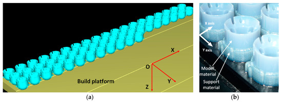 The orientation of the specimens on the build tray affects how quickly, efficiently, and qualitatively they will be manufactured by the AM system [40]. Additionally, within the PolyJet process, the orientation of parts has an influence on the quantity and where the support material is used. The circular specimens were printed in a standing up position on the build platform, as shown in Figure 3. It is advantageous to print a circular model that has holes standing up on the build platform, so support material does not fill the holes [38]. Additionally, if a circular model is lying down on the build platform and printed in glossy printing mode, then the surface quality is affected by some errors [41]. The experimental roughness (Ra) values for the PolyJet material jetting process are specified according to the finish type as follows: for matte finish in the range of 0.5–15 μm, and for the glossy finish in the range of 0.5–4 μm [42]. The dimensional accuracy and the quality of the surface of a circular artifact built in standing up position are not significantly influenced by the orientation and positioning on the build platform.