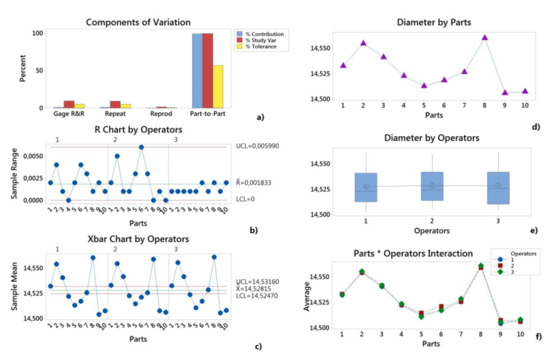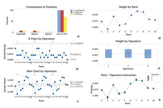 The variability of the measurement system was determined by Gage repeatability and reproducibility methodology. Repeatability is due to measuring instrument variation and reproducibility is due to operator (appraiser) variation. Gage R&R study was performed using the analysis of variance (ANOVA) method [47]. The ANOVA Gage R&R method estimates: