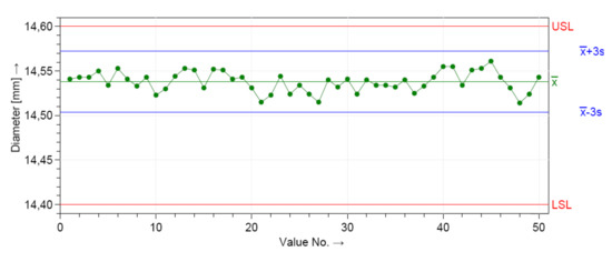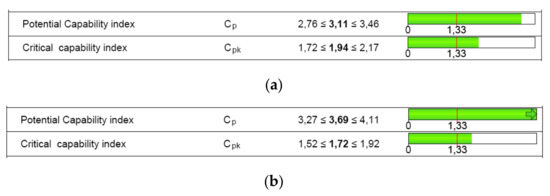 Capability analysis should be carried out for a new or changed production process and then over time to control the process according to the standard ISO/TS 16949 [36]. Capability analysis is summarized in indices that show the system’s ability to meet its requirements. Machine and process capabilities provide results on how well a machine and a process performs in relation to defined tolerance limits. These two branches differ because they are determined in different conditions, but principally similar indices are calculated. The target capability indices commonly used in the automotive industry are greater than 1.67, which corresponds to a safety or critical parameter for a new process [16]. The quality condition is excellent if the capability indices are between 1.67 and 2 [16,37].