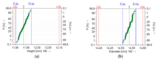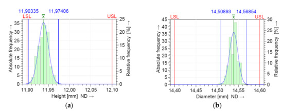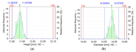 D and H dimensions of the parts were measured using the Mitutoyo 500-196-30 digital scale caliper (Mitutoyo Corporation, Kawasaki, Japan). System and process capability is determined by calculating the capability coefficients described in Equation (1). The lower specification limit (LSL) and upper specification limit (USL) are the targets set for the process. The potential machine and process capability indices (Cm, Cp) represent the number of times the process spread fits into the tolerance interval. A high potential capability index does not guarantee that the process is close to the target value, which is why the position of the process spread in relation to the tolerance interval is determined by calculating the critical capability machine/process index (Cmk/Cpk).
