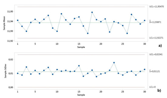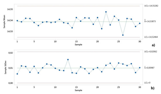 The location and dispersion were calculated using the M11,6 method according to the ISO 22514-2: 2017 standard [21]. Subscripts 1 and 6 refer to equations for calculating the estimator for the location and dispersion, respectively. This means that the arithmetic mean of the values is used for the location being assumed, and externally tested the normal distribution, and the distance between the edges 0.135% and 99.865% for dispersion. The reference interval of the product characteristic is bounded by the 99.865% distribution quantile, and the 0.135% distribution quantile. The length of the interval is X99,865%−X0,135% [35]. X50% represents the 50% distribution quantile.